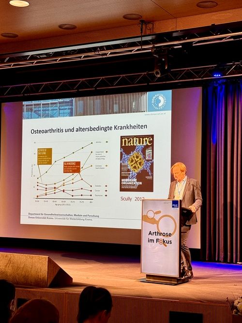 Im Mittelpunkt der Tagung standen aktuelle wissenschaftliche Fortschritte und neue Therapiemöglichkeiten. Univ. Prof. Dr. Stefan Nehrer, ein führender Experte auf dem Gebiet der Arthrose-Forschung, präsentierte die neuesten Erkenntnisse und diskutierte zukunftsträchtige Behandlungsansätze. Im Anschluss daran beleuchtete Dr. Markus Neubauer, PhD, die spannende Frage, ob es in Zukunft möglich sein könnte, Arthrose zu stoppen.